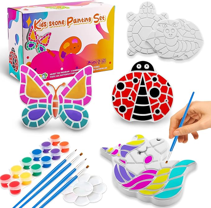 - DIY Stepping Stone Kit :No molding, no baking! Skip messy steps and make your own garden rock art right out of the box. Includes 5 unique shaped stones (unicorn, butterfly, turtle, ladybug, caterpillar) – perfect for kids' painting activities. Just grab brushes and let creativity flow!