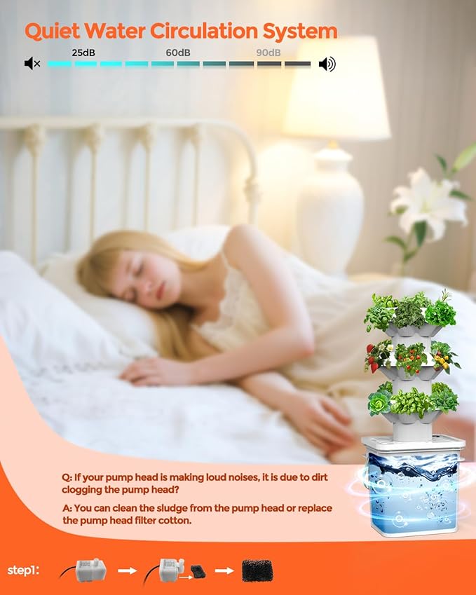 - Intelligent cycle irrigation: The indoor gardening system uses advanced circulation technology, built-in automatic circulation silent water pump, automatic operation to produce regular water flow, creating a perfect ecosystem for the root system. Silent water pump can automatically circulate nutrient solution, with water level gauge, water shortage time clearly visible. Ensure the healthy growth of plant roots.