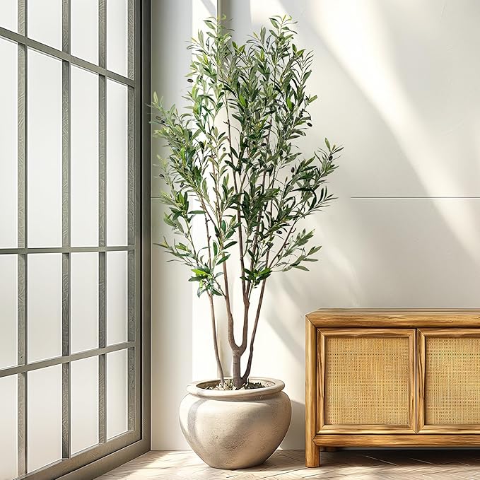 7FT Artificial Olive Tree Tall Faux Silk Plant Tall Faux Olive Tree with Natural Wood Trunk & Lifelike Fruits Fake Potted Tree or Home Office Decor