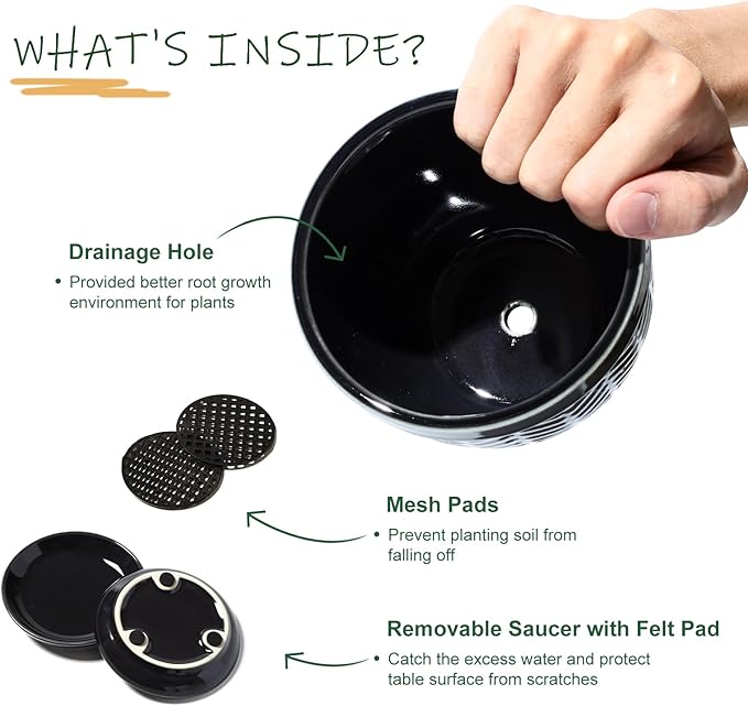 - Ceramic Plant Pots with Drainage Hole: Each small plant pot measures 4.7’’W*3.7’’H , which is the ideal for growing small and medium sized plants, such as succulents, snake plants, cactus, orchid and small flower. The flower pots has a central drainage hole and saucer to ensure adequate drainage and ventilation to avoid root rot, and include a 1.7 inch diameter mesh to prevent soil from falling out