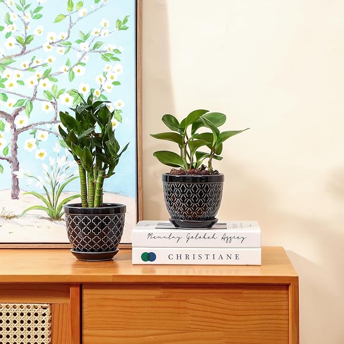 Sureasy Ceramic Plant Pots, 4.7 Inch Flower Pots for Indoor Plants, Succulent Pots with Saucer and Drainage Hole, Decorative Planter for Succulent, Cactus, Set of 4, Black