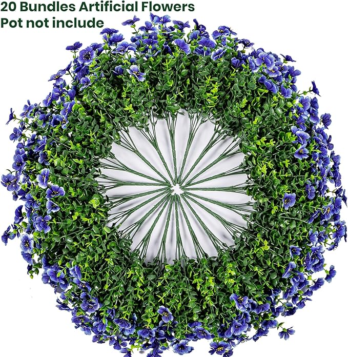 20 Bundles Artificial Flowers for Outdoor Fake Plants for Spring Decoration,Faux Eucalyptus Flowers for Planter UV Resistant Lifelike for Home Porch Garden(Blue)