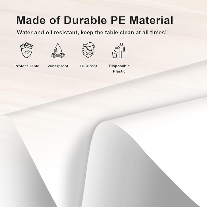 - 【Waterproof and Stain Resistant】The white tablecloth is made of plastic material, it is waterproof and stain resistant, it can protect the table and its surface from spills, debris and stains, making it easy to clean up after the party. If you're tired of washing all your tablecloths, white plastic table cloths for parties disposable are a great solution! Simply roll them up and discard them after the party. Save yourself the hassle of clearing the table and allow you to spend more time enjoying the party with your family and friends