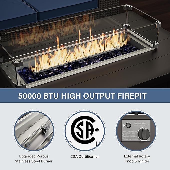 - 55000 BTU Fire Pit Table: The outdoor firepit table ensures superior quality, safety, and reliability. Featuring an upgraded porous stainless steel burner and push button rotary ignition, the heat output is 55,000 BTUs upon ignition for even burning and plenty of warmth. The propane fuel used is clean and non-polluting and comes with a metal cover for the tabletop, which can be used as an everyday dining table