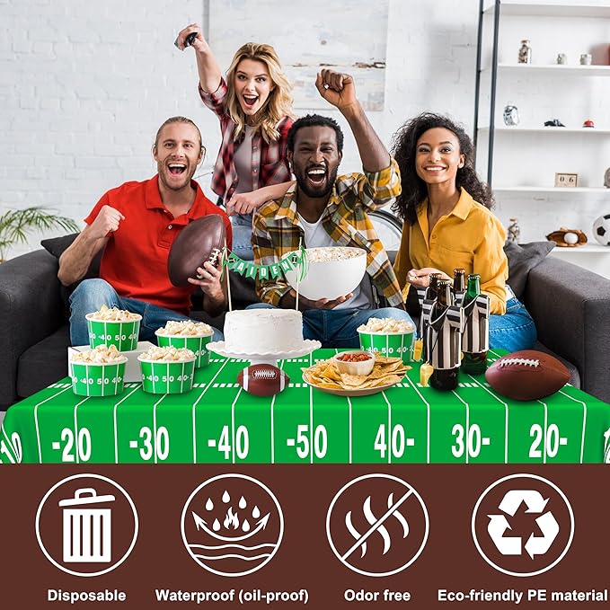 - 【Enjoy Your Party】The football party plastic table cloths for parties disposable features a football theme to add a fun pop of color to every of your gatherings. Impress your guests throughout the party. When the party is over, you can spend more time with family or friends and less time cleaning up