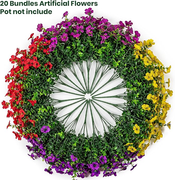 20 Bundles Artificial Flowers for Outdoor Fake Plants for Spring Decoration,Faux Eucalyptus Flowers for Planter UV Resistant Lifelike for Home Porch Garden(4 Color)