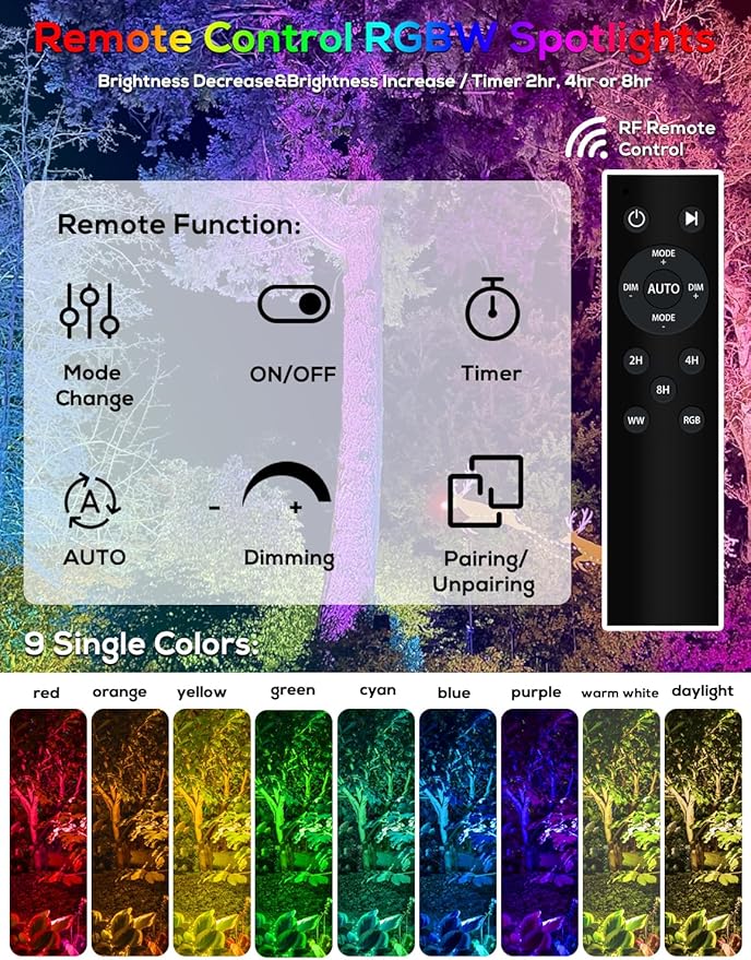 - 【Various Color Options & Timer Function】Our color solar spotlight not only provides warm white and daylight, but also offers a range of vibrant colors. Using the remote control, you can easily adjust brightness, change colors, switch lighting modes and set timers