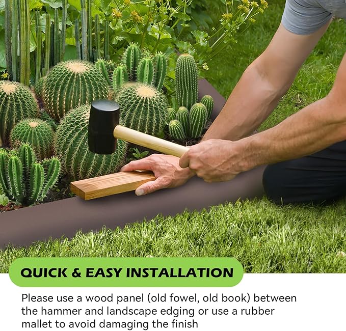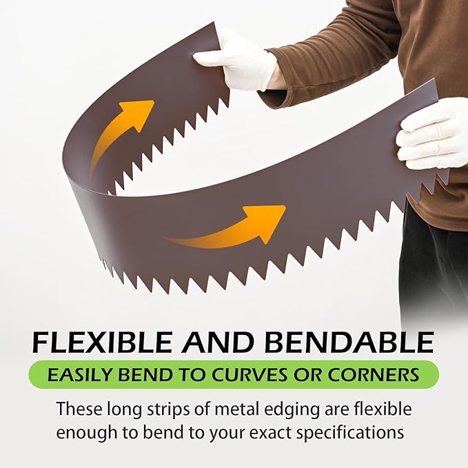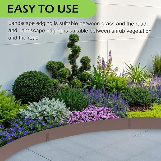 - Easy installation design: Steel landscape edging keep your micro-bark from washing off into the street during rain. Easy to pound into the ground. Easy to bend, hammer and adjust; NOTE: The top is polished, will not scratch the hand, but please put on gloves to avoid scratch. Support remolding.