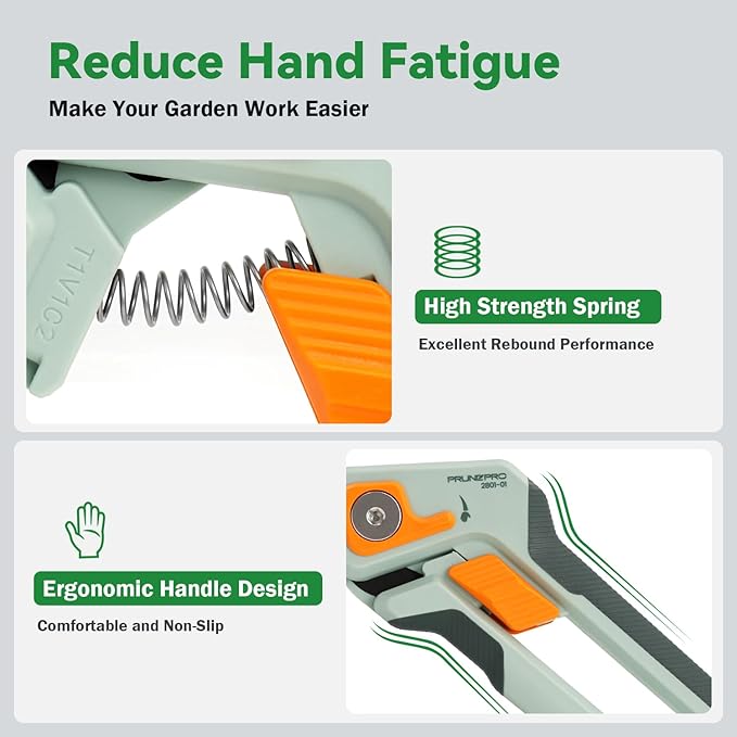 - 【Ultra Sharp Blades】Our blades, crafted from 1.4031 German stainless steel and coated with "Diamond" Teflon technology, provide low friction and high wear resistance. This enhances sharpness of our garden scissors, making every cut easy and smooth. PrunePro garden shears ensure a clean, flat cut on branches without crushing or damaging your plants