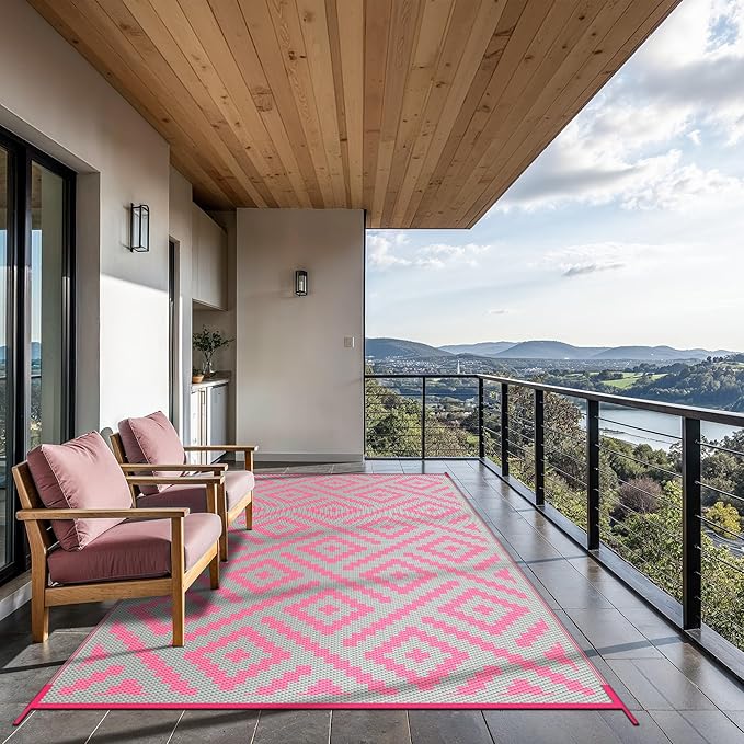 GENIMO Outdoor Rug for Patio Clearance, 6'x9' Reversible Plastic Straw Rugs, Lightweight Waterproof RV Camping Mat for Camper, Balcony, Deck, Backyard, Picnic, Pink & Grey