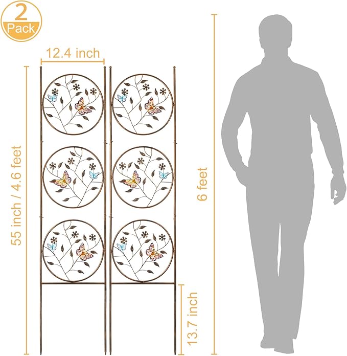 - Garden Decor: This pair trellis features 6 lifelike butterflies perch on the florets with bronze powder coating, and it comes with ornate leaf curling design which encourages your climbing vines and flowers to flourish. The butterflies are finished with a charming gradient effect