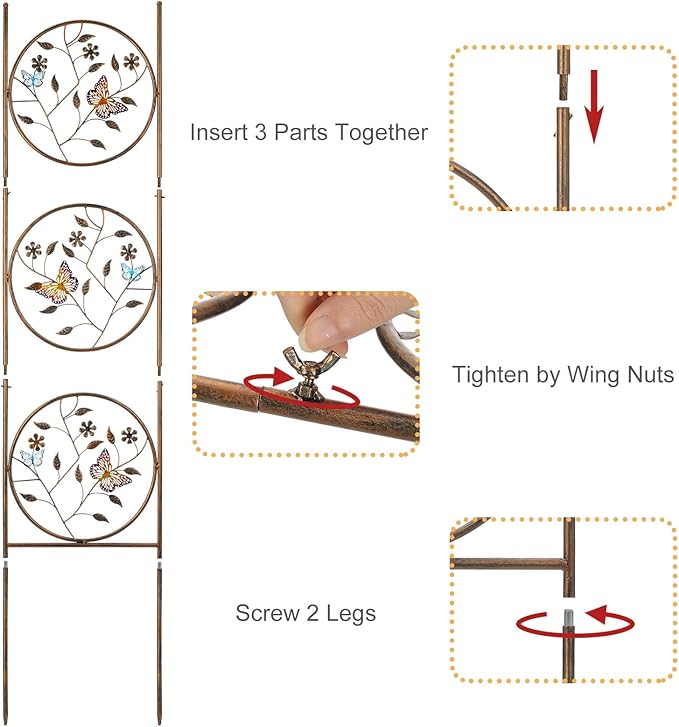 - Easy to Assemble: This pair of trellis is handcrafted and constructed of sturdy, it made from iron under a thick finish of bronze powder-coat. Easy installation is required, just insert 3 parts together, tighten by wing nuts and screw 2 legs on to stake into the ground or pots