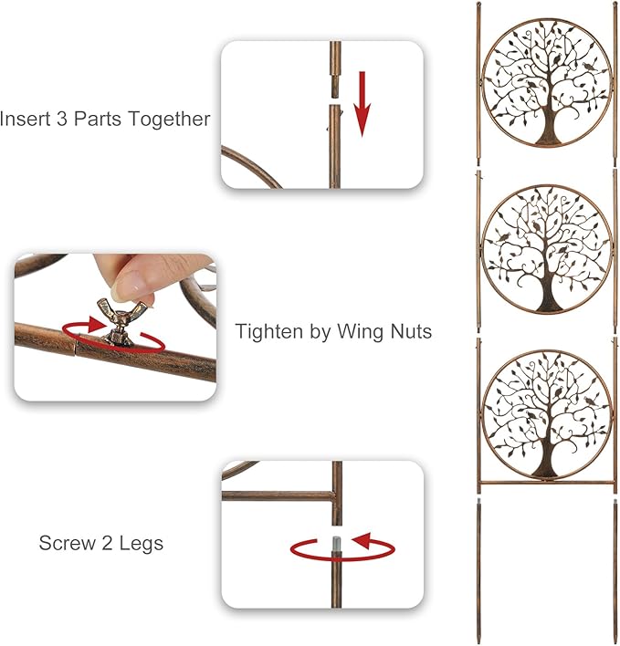 - Easy to Assemble: This pair of trellis is handcrafted and constructed of sturdy, it made from iron under a thick finish of bronze powder-coat. Easy installation is required, just insert 3 parts together, tighten by wing nuts and screw 2 legs on to stake into the ground or pots