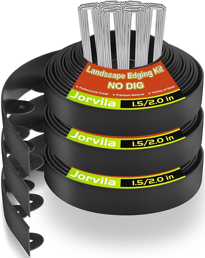 - Easy Installation: Jorvila garden edging can be installed without the help of professional tools and digging; Just need to stake garden border in the shape you want with metal spikes every 2-3 holes