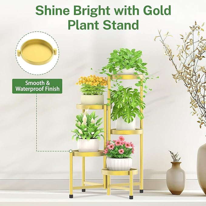 iDavosic.ly Plant Stand Indoor Outdoor, 5 Tier Corner Metal Flower Display Holder Shelf, Folding Tall Orchid Rack for Patio Balcony Porch Garden Living Room House, Gold