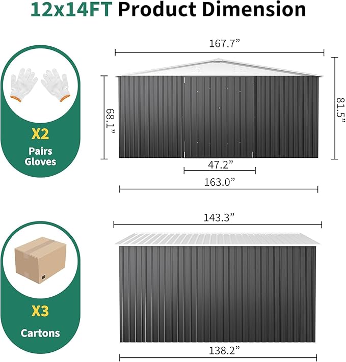 - 【Spacious Storage Solution】Measuring a generous 167.7"D x 138.5"W x 86.1"H, our shed offers ample space to house your gardening tools, equipment, and outdoor necessities without clutter.