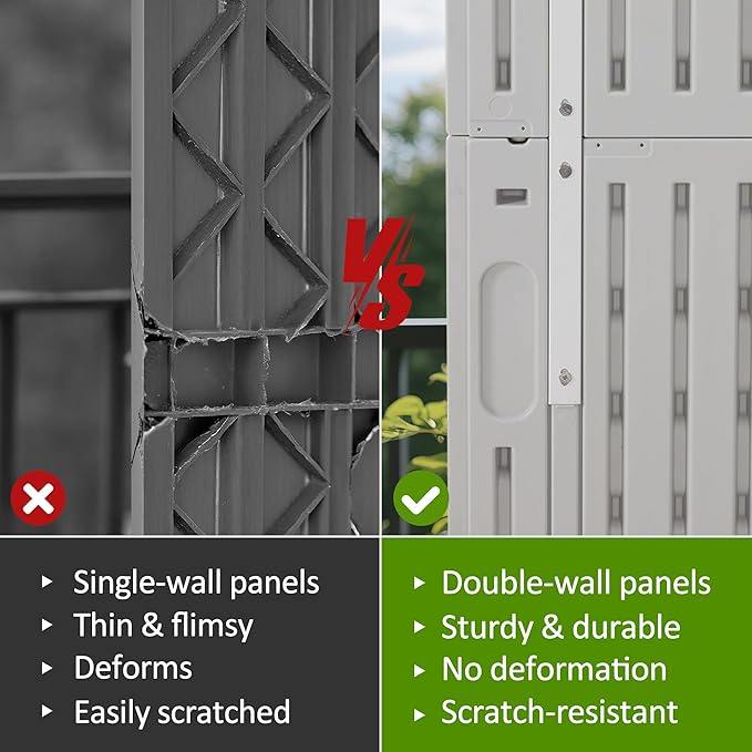 - Double Panels: The shed outdoor storage features double panels that won't easily bend or puncture