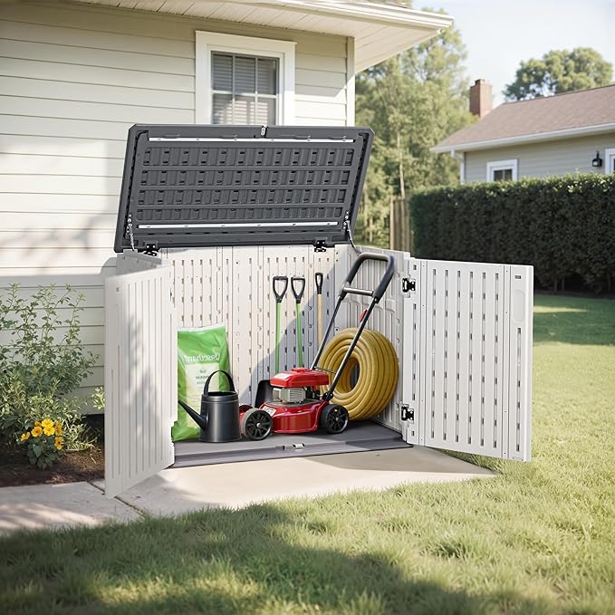 Macrout 25 Cu.Ft Small Plastic Outdoor Storage Cabinet with Floor, 4.3 x 2.5 ft Waterproof Resin Outdoor Storage Shed, Lockable Horizontal Shed for Garden and Patio