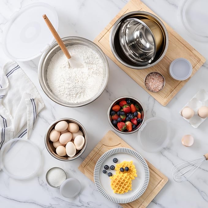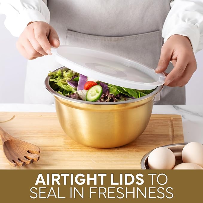 - Elegance Meets Function – These beautiful stainless steel mixing bowls with lids add style and function to your kitchen. Perfect for meal prep, freezer, serving, or display, they elevate everyday cooking & baking with a touch of sophistication.