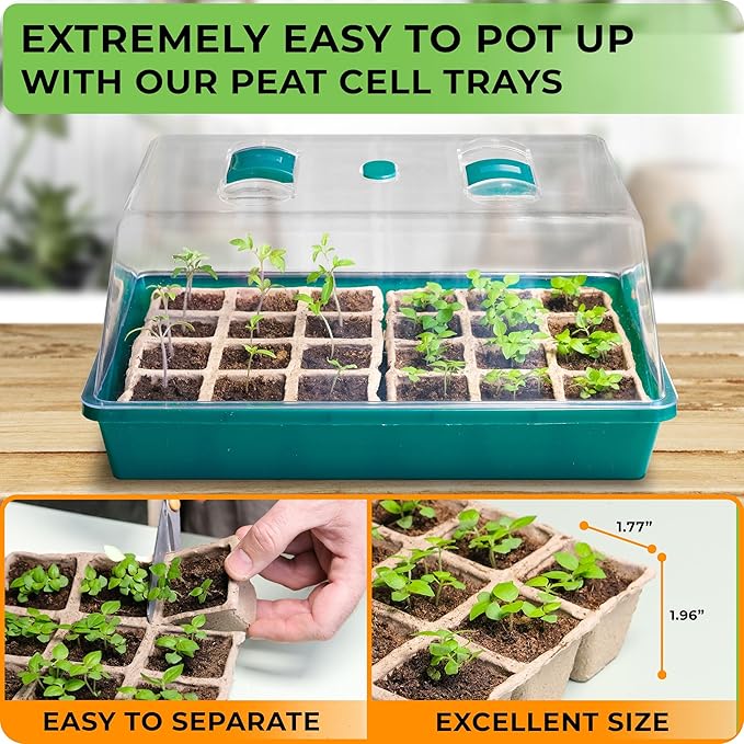 - Hassle-Free Transplanting with Peat Pots Cells – Our starter trays for planting seeds feature 48-cell peat pots inserts, making it easy to move seedlings without disturbing roots. The seedling trays with dome can be planted directly into the soil, promoting healthy root development. Ideal for anyone looking for starter seed trays, seed starters trays, or a garden seed starter kit to grow vegetables, herbs, and flowers