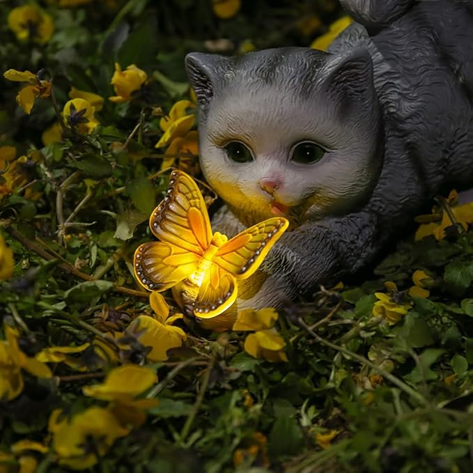 Solar Cat Statue with LED Lights & Butterfly - Outdoor Garden Decor for Patio, Lawn, Yard - Waterproof Cat Figurines, Housewarming Gardening Gifts for Women, Mom, Grandma