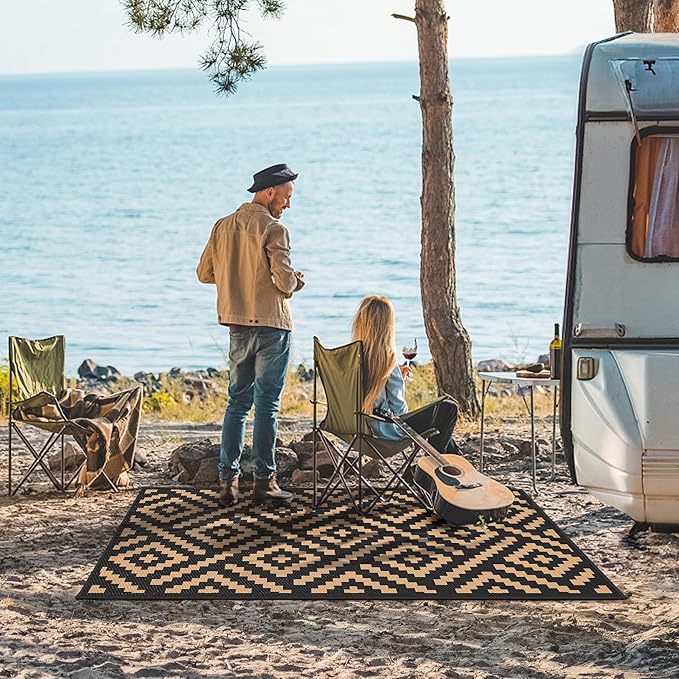 - Extended Lifespan · Dual-Sided Wear Resistance: The GENIMO outdoor rug features a reversible design with two classic geometric patterns, doubling its lifespan through alternating use. The dark-toned surface effectively conceals dirt, stains, and fall debris, maintaining a pristine appearance even in rugged environments. Perfect outdoor patio rugs, RV mats, and camping rugs for indoor-outdoor transition zones—effortlessly switch sides for practicality and timeless decor.