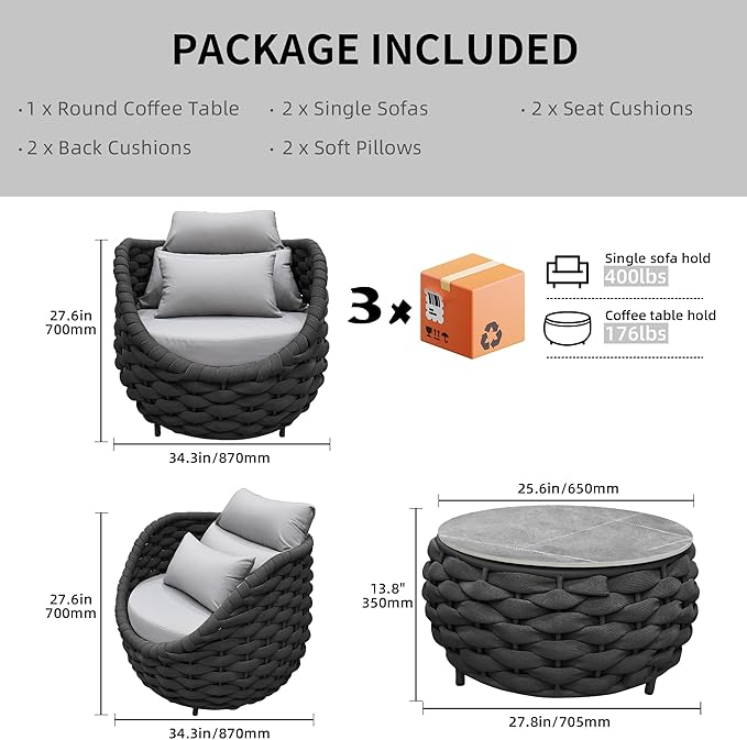 - Dimension,No Required Assembly - Single Chair: 34.3"(L) x 33"(W)x27.6 "(H);Round Table:28"(W) x 13.8"(H).Patio furniture can hold 400 lbs for each seating.Round coffee table can hold 176 lbs.Get your outdoor life refreshed with 3 piece aluminum patio furniture.