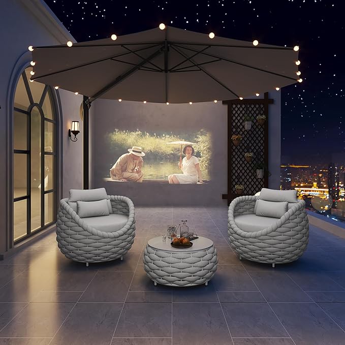 - 【No Required Assembly & Easy To Maintain】Our modern patio furniture set requires no assembly, just place the cushions on the chair frame and tabletop put on the suction cups and you are ready to enjoy. Owning to its features of rust, and moisture-resistance, it is unfazed by whatever nature throws its way. Our worry-free after sale service and friendly customer service.Detail tracking information or other questions about products please contact us by amazon message