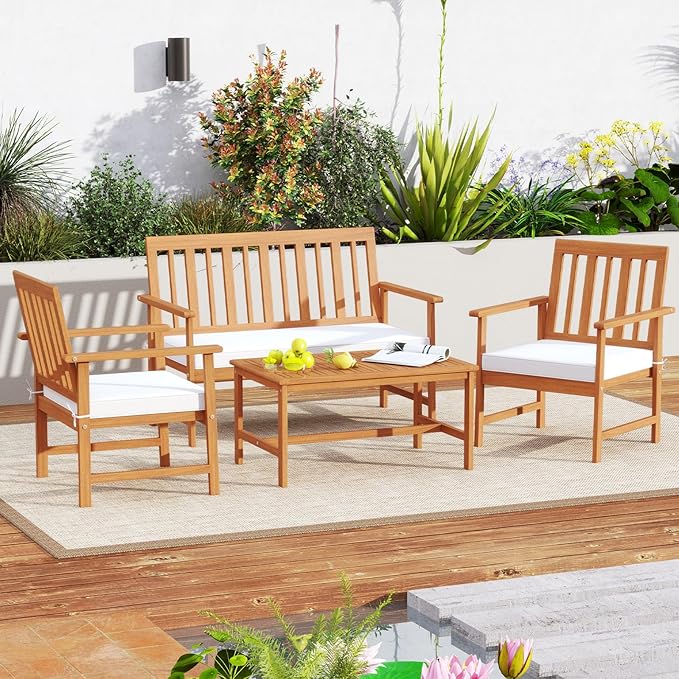 Tangkula 4-Piece Acacia Wood Patio Conversation Set, Outdoor Furniture Set with 2 Armchairs, Loveseat, Coffee Table, Soft Cushions, Slatted Sofa and Chairs Set for Deck, Backyard (Off White,1)