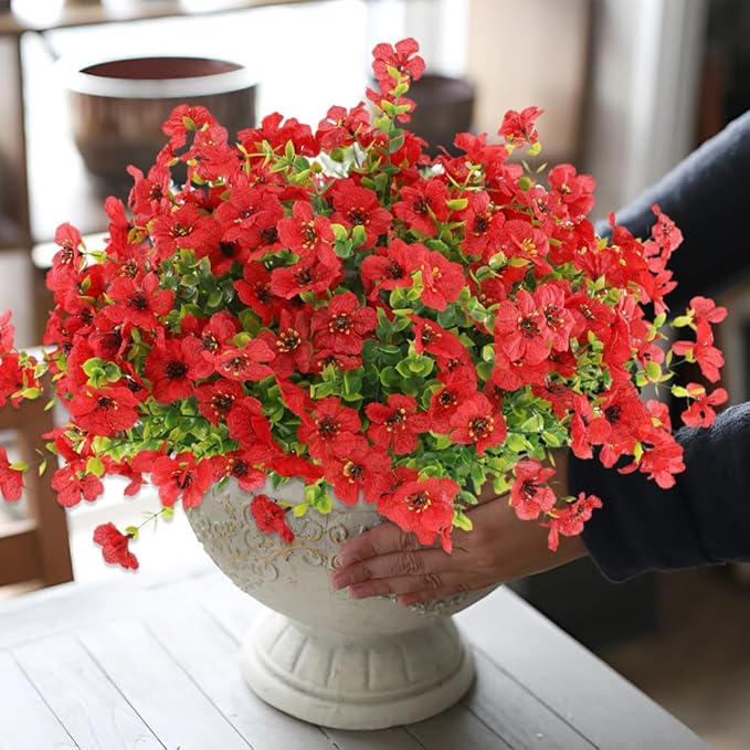 Artificial Fake Flowers Outdoor Spring Summer Decoration, 16 Bundles Faux Eucalyptus Violet Realistic UV Resistant for Outside Home Planter Porch Patio Yard Decor (Red Eucalyptus)