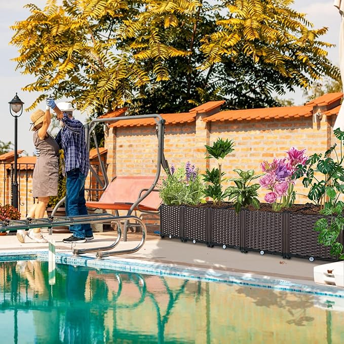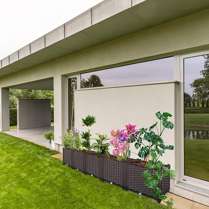 - 【Watering System with Reservoir】:The flower box features self-watering disk & drainage holes, can provide water reservation spaces to avoid plants over-drying when forget to water for some time. Drainage holes will effectively drain out excess water, preventing roots from decay.