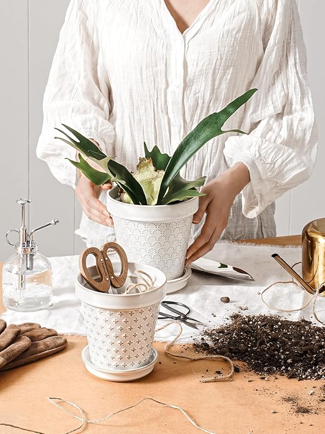 - Decor Living Space: Discover a cute embossed design ceramic pots –4.9 inches in diameter and 3.9 inches top opening, good for small and medium sized plants and flowers such as succulents, African violet, vanilla, basil, etc. These ceramic flower pots add a touch of green to tables, windowsills, balconies, or bookshelves. The delicate balance of embossed design and botanical vitality converges, creating an atmosphere of unparalleled grace and visual delight