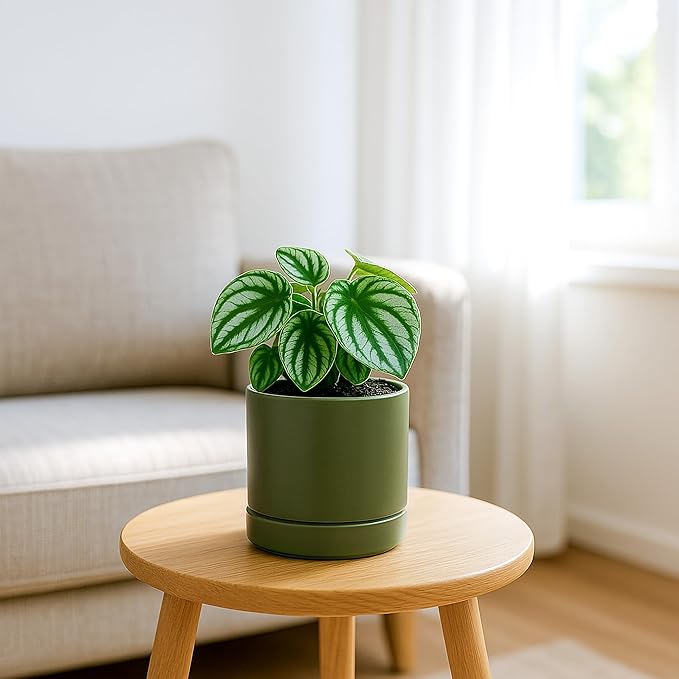 D'vine Dev Set of 4 Small Ceramic Plant Pots, 4.7 Inch Succulent Planter Pot for Plants with Drainage Hole and Saucer, Olive, 94-X-B-0