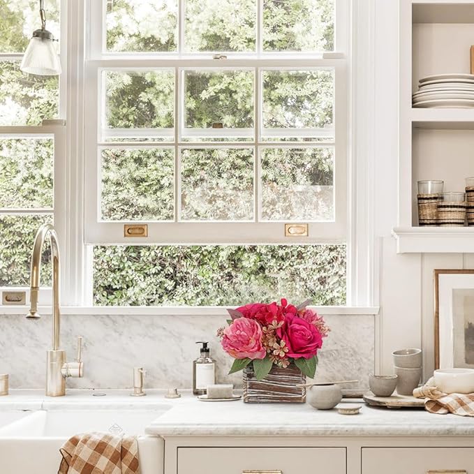 - PERFECT GIFT - These potted flowers are not only good for home decor indoor but also Give these Flower Arrangements with the wooden vase as a gift for housewarming parties, birthdays and Christmas. An ideal choice for window, coffee table, bookshelf, kitchen, hotel, office, bedroom, farmhouse, backyard, balcony decoration