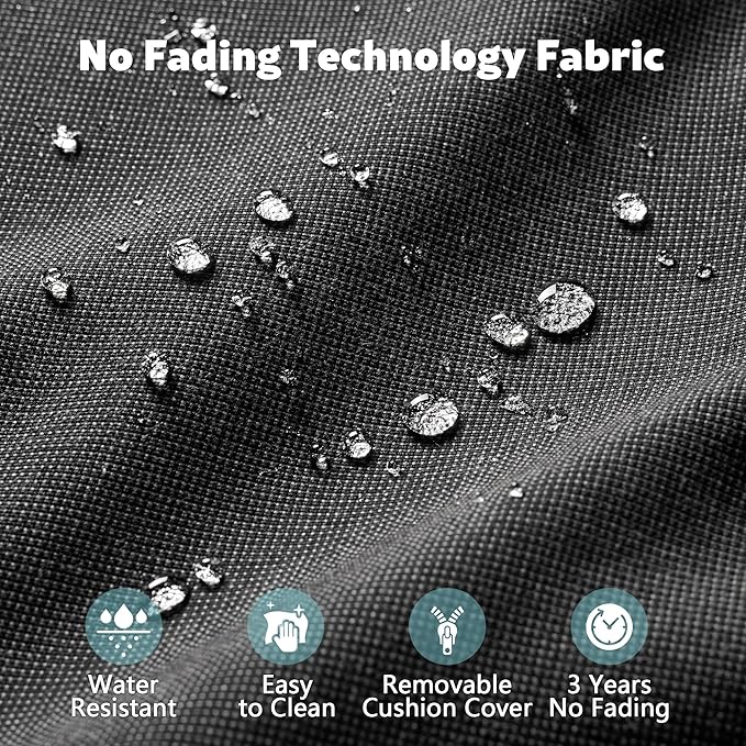 - Non-Fading Fabric:3-Year-Non-Fading,made with high-density foam that is soft and supportive, and covered with a breathable fabric that is easy to clean and maintain. The cushion covers are also water resistance, stain-resistant, ensuring they remain in excellent condition in all weather conditions