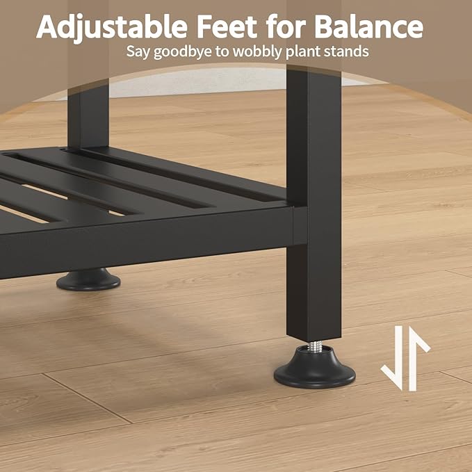 - 【Adjustable Feet for Balance】The included 4 adjustable feet conquer uneven floors effortlessly. Simply twist to stabilize your plant stand on tile, wood, or carpet while protecting delicate surfaces from scratches. Just pure stability wherever your greenery lives.
