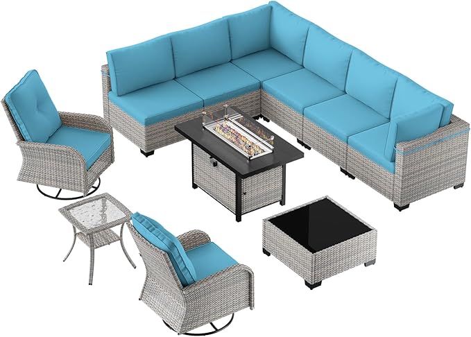 11-Piece Patio Furniture Set, Outdoor Patio Furniture with 55,000 BTU Fire Pit Table, Swivel Chairs Set, Thick Cushions, Modular Patio Sofa, Dual-Strand Wicker Rattan, Rust-Resistant Frame, Lake Blue