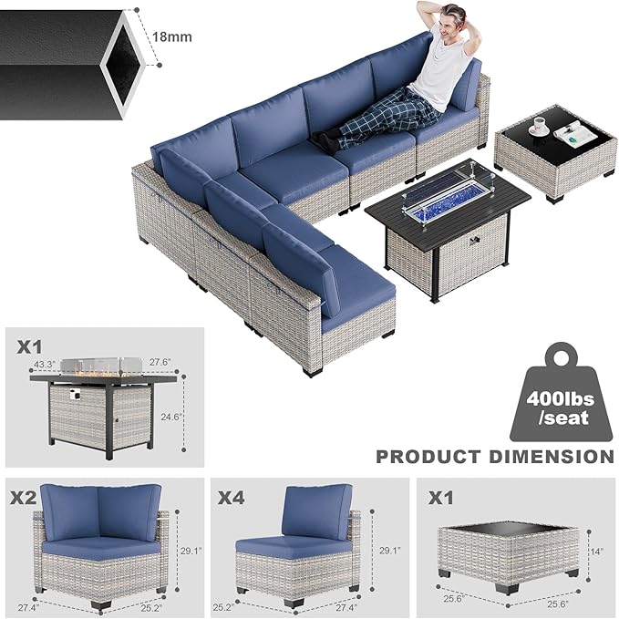 8-Piece Modern Patio Furniture Set with 55,000 BTU Fire Pit Table, Thick Cushions, Dual-Strand Wicker Rattan, Rust-Resistant Frame, Navy Blue