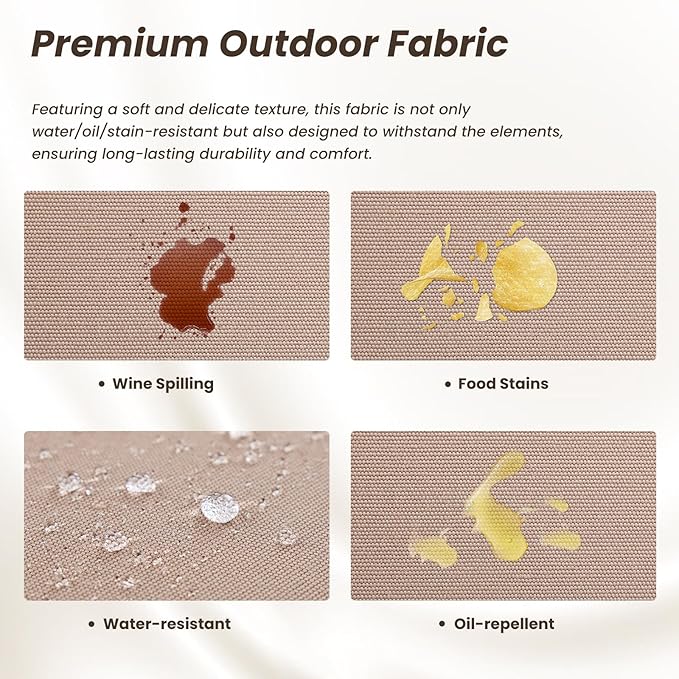 - [LOW MAINTENANCE OUTDOOR FABRIC]: The fabric of this patio furniture set is crafted to offer superior protection with its water-resistant, stain-resistant, and oil-resistant properties. It keeps the cushions dry and looking fresh in most outdoor conditions, while also making cleaning a breeze by easily repelling dirt, spills, and food stains.
