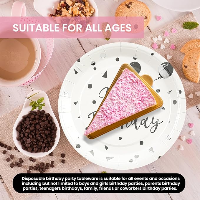 - 【STYLISH AND UNDERSTATED DESIGN】:The paper plates are white in color and designed with sliver happy birthday, sliver foil dots and triangles and sliver balloons. These classic design elements can make your party more elegant and stylish while dining, very aesthetically pleasing, and I'm sure your guests will really love this design!