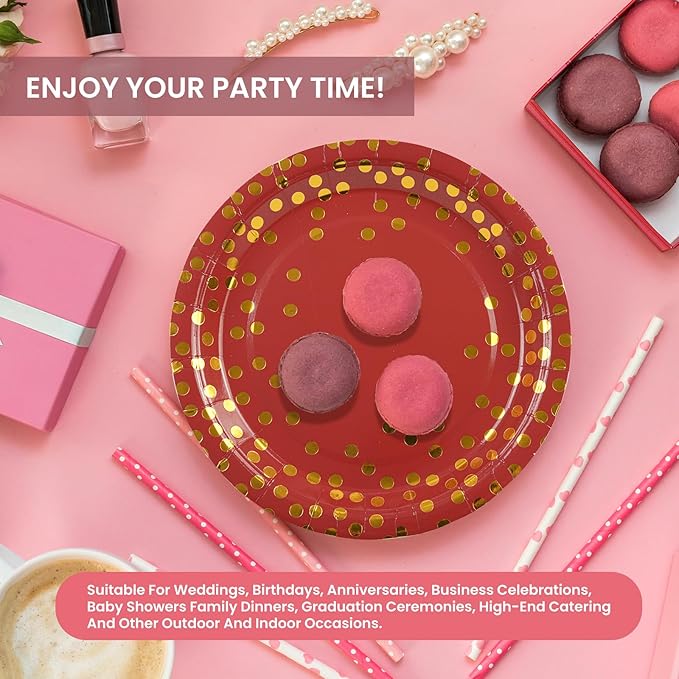 - 【HIGH QUALITY MATERIALS】: Our red and gold dot paper plates are made of 350gsm thickened eco-friendly paper, not easy to break or tear, durable, safe and non-toxic, BPA free biodegradable, convenient and environmentally friendly, no need to worry about harming the environment. The napkins are made of food grade water-based ink, highly absorbent and very skin-friendly.Please do not microwave the paper plates!