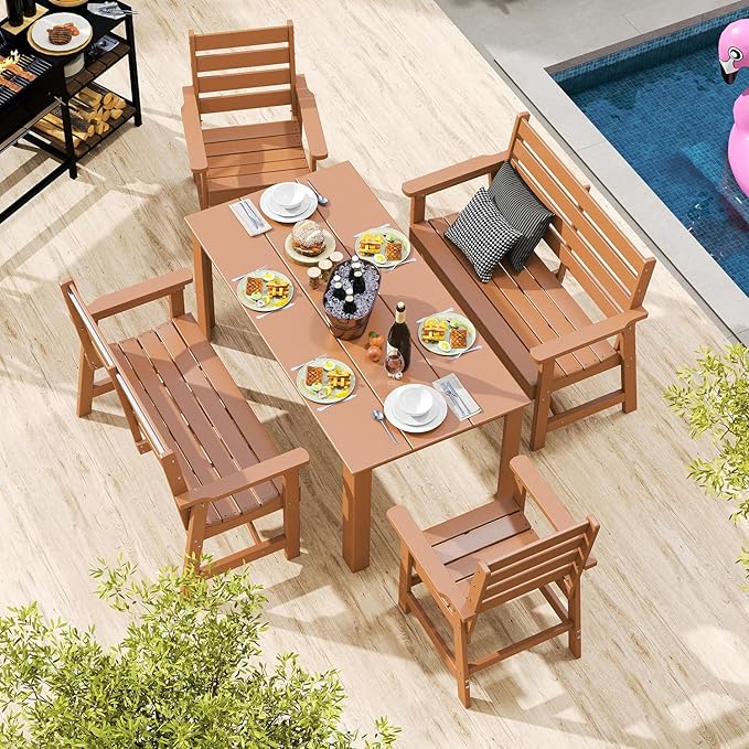 - 【Premium HDPE】Crafted from GreenVines HDPE (High-Density Polyethylene), this outdoor bench outperforms traditional metal and wood materials. It is waterproof, weather-resistant, and fade-resistant, ensuring it won’t rust, chip, peel, crack, or rot, even in harsh outdoor conditions