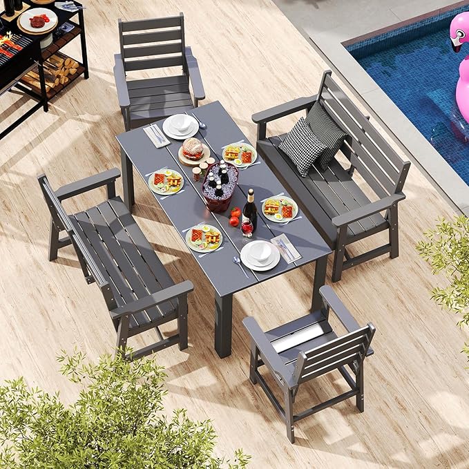 - 【Premium HDPE】Crafted from GreenVines HDPE (High-Density Polyethylene), this outdoor bench outperforms traditional metal and wood materials. It is waterproof, weather-resistant, and fade-resistant, ensuring it won’t rust, chip, peel, crack, or rot, even in harsh outdoor conditions