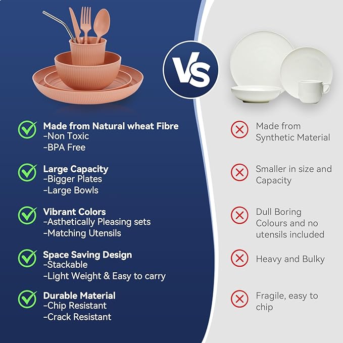 - High quality and purity material:This Oecan Coral Wheat Straw Dinnerware set is made of natural straw fiber & food grade safe PP materials. Its 100% BPA free, non-toxic. It is not only reusable, but also protects the health of you and your family because its material does not contain harmful chemicals. Choose our unbreakable dinnerware for a reliable and stylish option. Made from wheat straw, these dishes are lightweight and sturdy, offering a perfect blend of functionality and modern design for any dining setting.