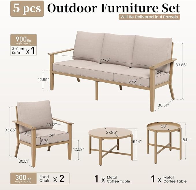 - SUNSHINE VALLEY OUTDOOR FURNITURE SETS: The metal outdoor furniture set includes 1 3-seater sofa, 2 single chairs, and 1 set of nesting tables.Each single chair can support 300 lbs, and the 3-seater sofa can support 900 lbs.Suited for your backyard, porch, garden, and deck,this set creates a comfortable outdoor space for your family