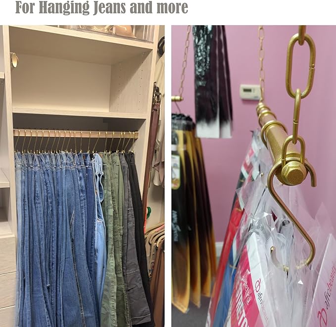 - CONVENIENCE: Gold towel hooks, no need to worry about tools or punch holes in smooth walls. Gold S shaped hooks can be easily hung on existing objects and tracks without the need for nails, screws or adhesives