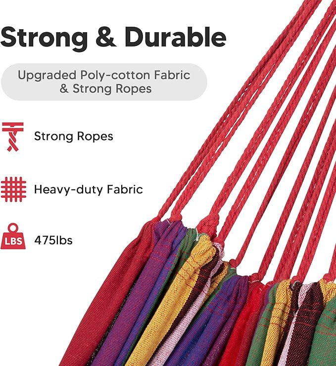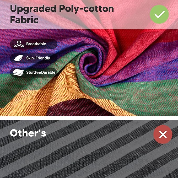 - Upgraded Fabric: Our Brazilian Camping hammock is made of eco-friendly thicker version poly-cotton fabric (no lint, no odor, not pilling, not fading, skin-friendly, and breathable), stronger and much more durable than ordinary fabric hammocks. A comfortable cocoon style hammock can keep you safe while enjoying the peaceful leisure time