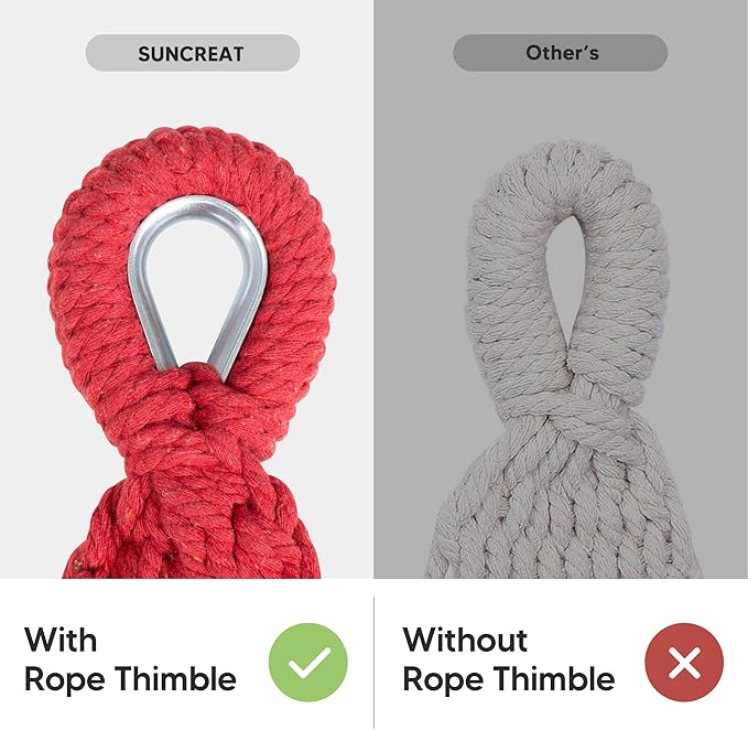 - Handcrafted Ropes: The metal rope thimble is effective for preventing the long-term friction between the tree strap and the ropes, thus prolong the service life of the hammock. The 18 ropes at both ends of the hammock are made of poly-cotton, tightly braided and fixed, which greatly increase the load bearing capacity