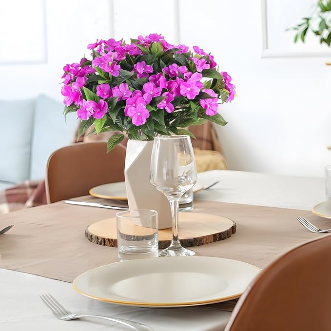 - What you will get: Total 8 Purple Impatiens branches. Adorable artificial flowers add fun to flower arrangements and easily bring a lush, fluffy look to your flower arrangements.