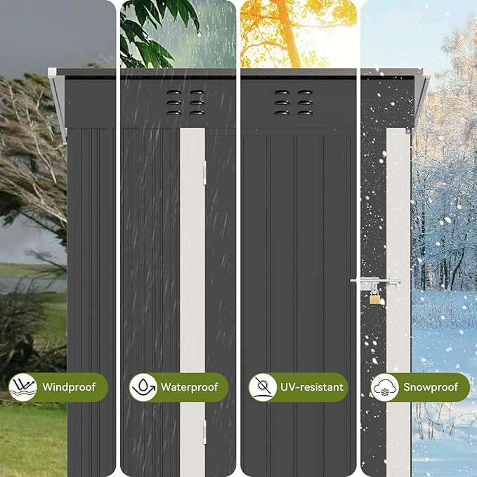- Waterproof Tool Shed:The sloping roof design of this storage outdoor shed maximizes space utilization;effectively direct rainwater away from the structure to prevents the leakage,Don't worry about your items getting wet